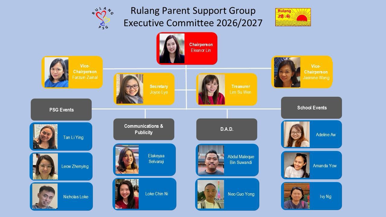 Since its inception in 2006, the Parents Support Group (PSG) of Rulang Primary School has played a pivotal role in engaging parents of our existing students, in support of our children's education. In strengthening ties with the School, the PSG actively participates and supports in various school programmes and functions such as the annual Racial Harmony Day celebrations, Mother Tongue Fortnight and Earth Day activities, just to name a few. Since 2014, the PSG also leads the organisation of the annual Teachers' Day Concert in appreciation of our children's dedicated teachers, through performances and gifts put together by participating parents and selected students.